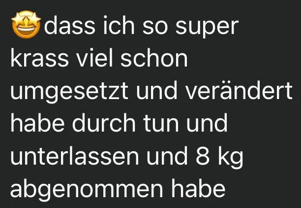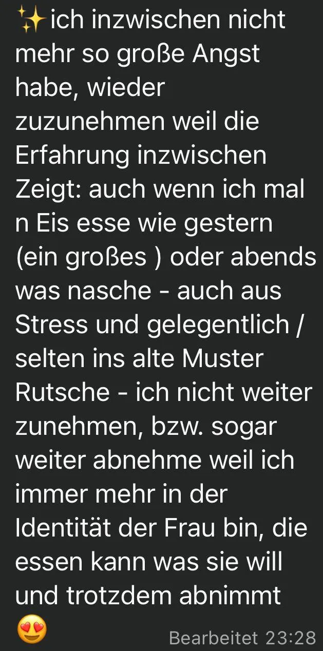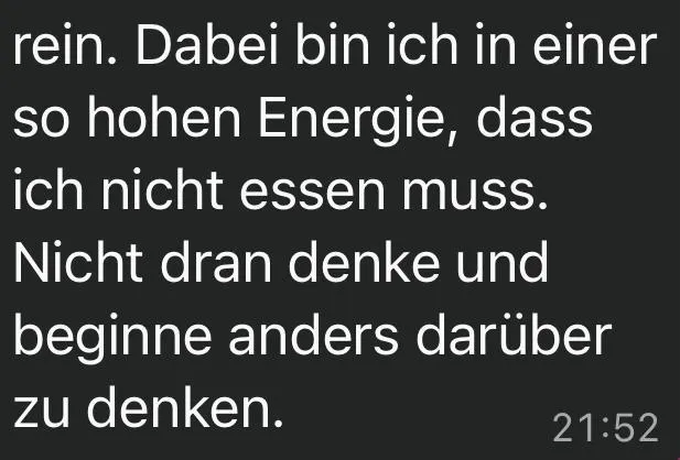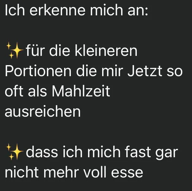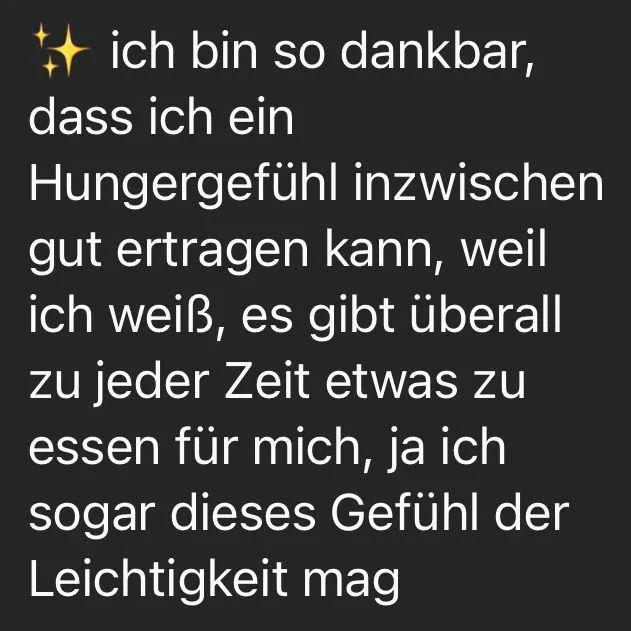 Ich bin zu Hause in meinem Körper. Ich weiß, wann ich wirklich hungrig bin – und wann ich einfach nur innerlich etwas brauche. Ich esse nicht mehr aus Frust, sondern aus Freude. Ich fühle mich leicht, kraftvoll und frei. Ich treffe klare Entscheidungen – für mich. Ohne Druck. Ohne Diät. Ohne Drama.